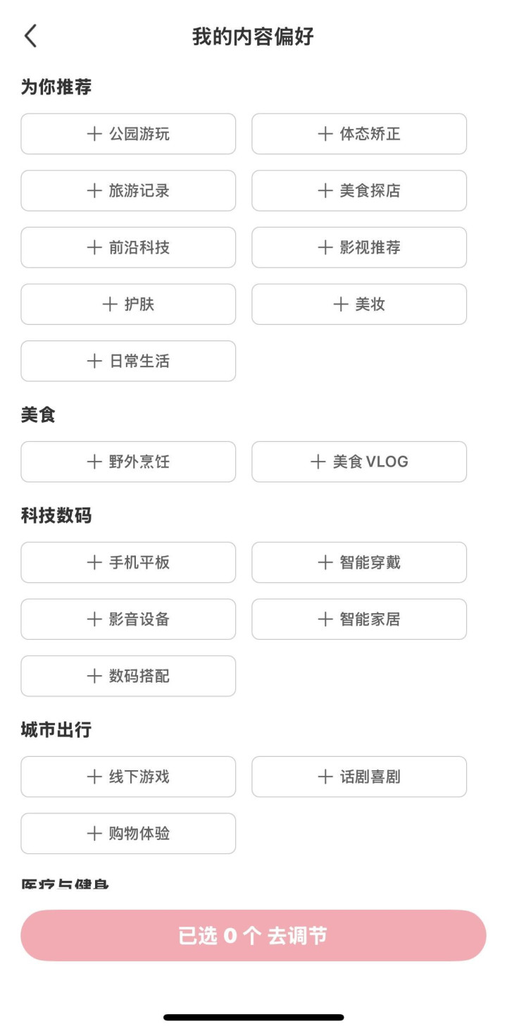 同时,用户还能直接删除不感兴趣的内容标签,点击“调节更多内容”,另有数十个内容标签可供添加。这意味着,如今用户可以自主调节平台推送内容的偏好,很大程度上决定在App看到哪些内容。