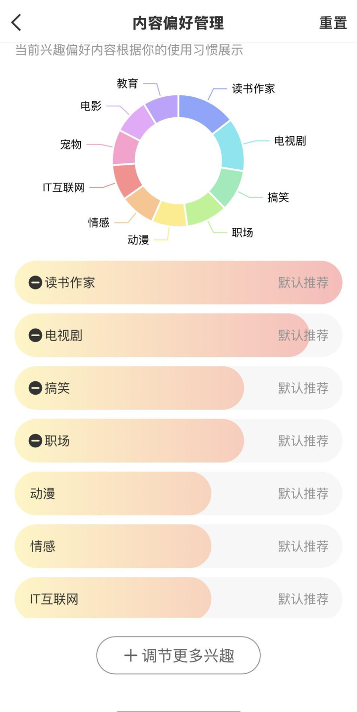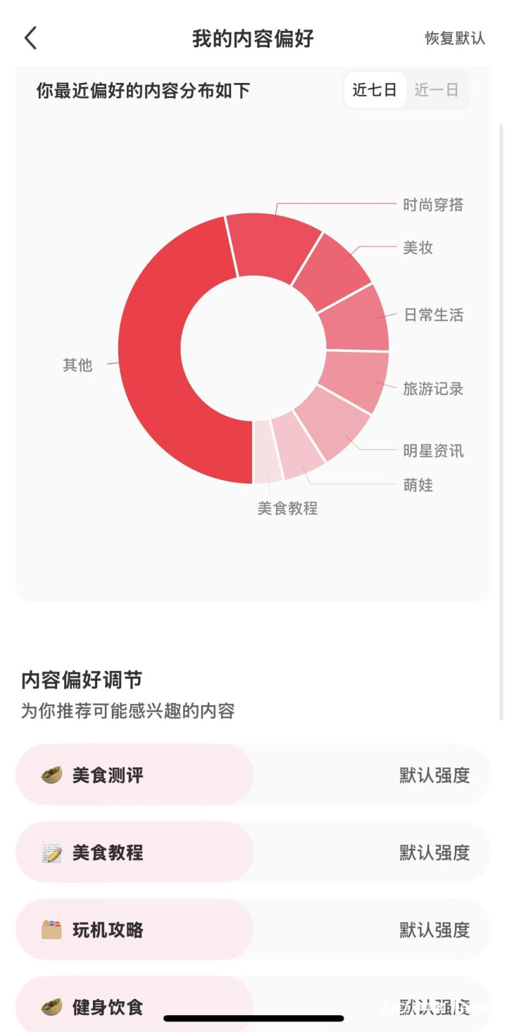 在饼状图下方的“内容偏好调节”板块中,用户可通过移动滑块,自行调节不同类别内容的推送强度,具体分为“减少推荐”“默认强度”“增加强度”三个档位。