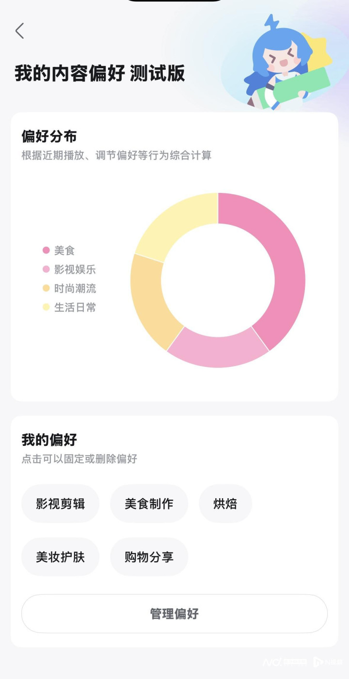 哔哩哔哩App内,在“我的-设置”页面,通过“隐私权限设置-个性化内容推荐管理”,进入“首页推荐内容偏好测试版”,即可看到以饼状图展示的用户偏好分布情况,并注明“根据近期播放、调节偏好等行为综合计算”。页面下方“我的偏好”板块,用户可点击固定、删除、添加偏好标签。